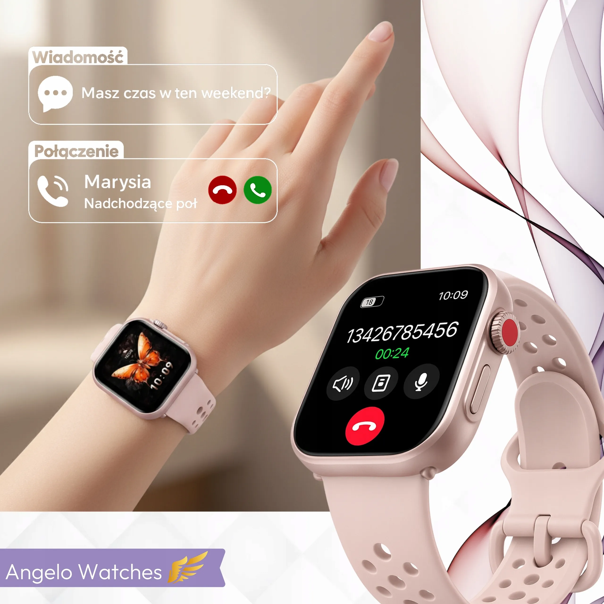 ✅ Elegancki wygląd i kobiecy styl – delikatna forma koperty, pastelowy pasek i dopracowane detale tworzą biżuteryjny charakter smartwatcha.