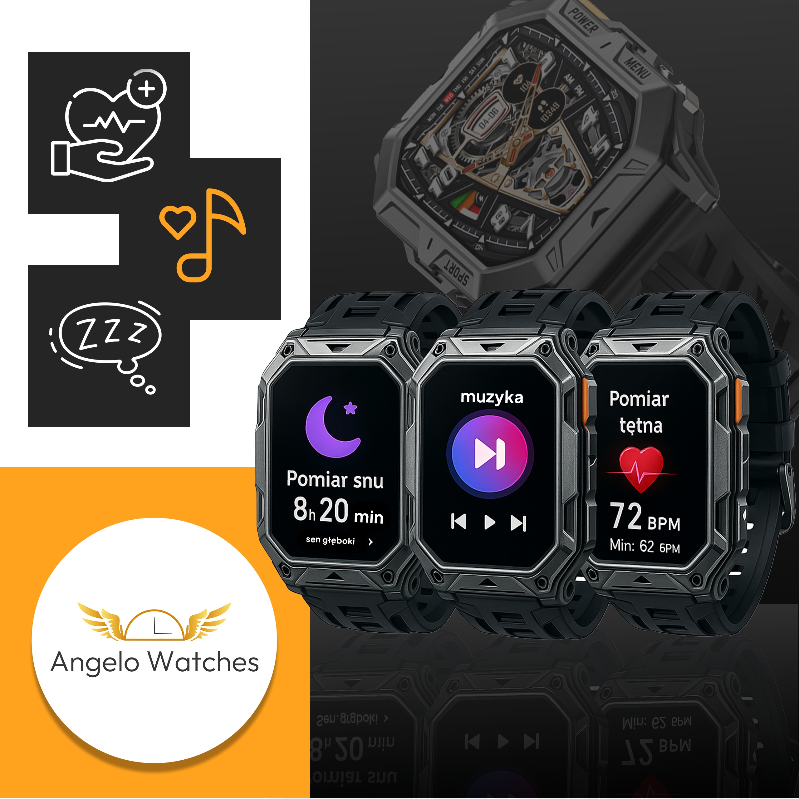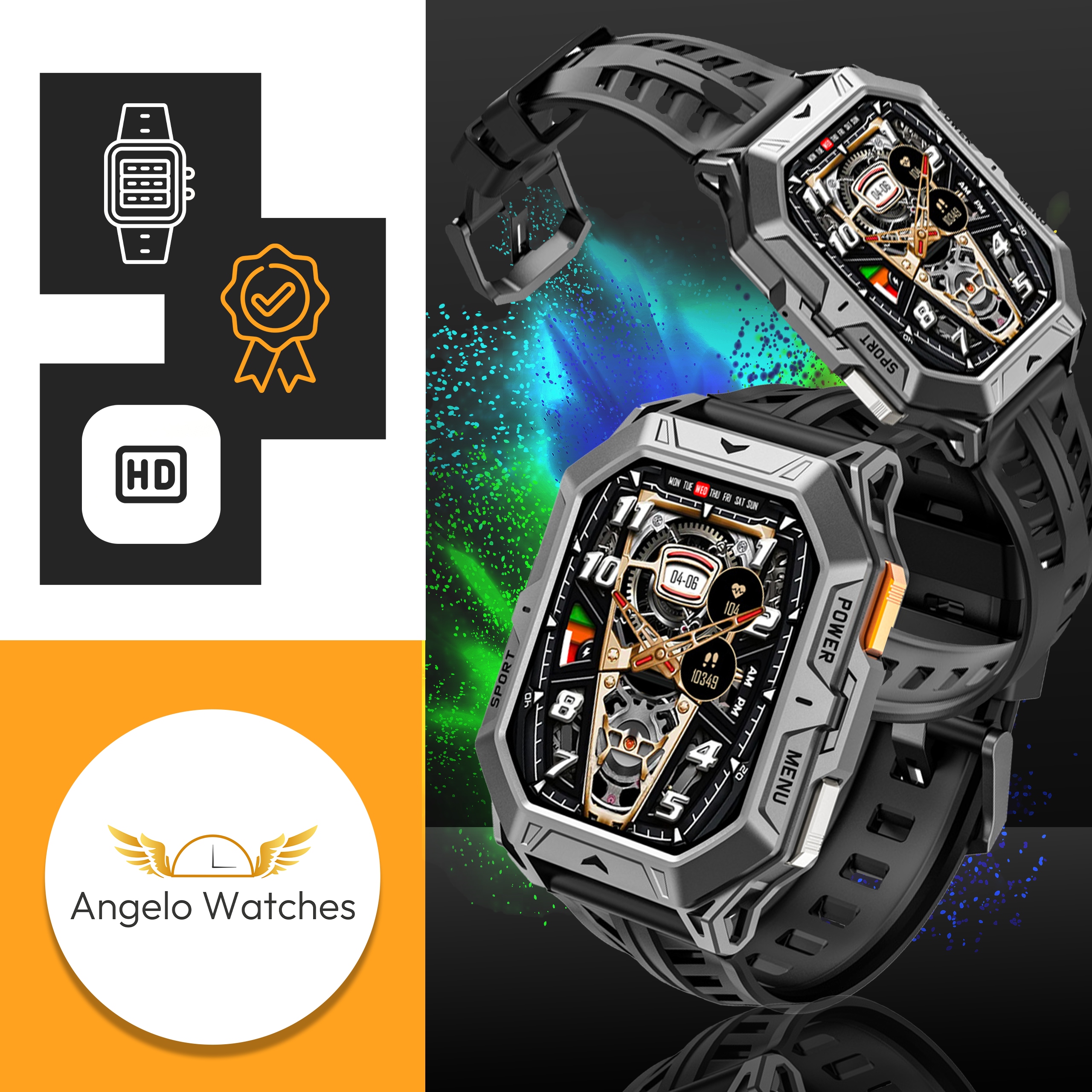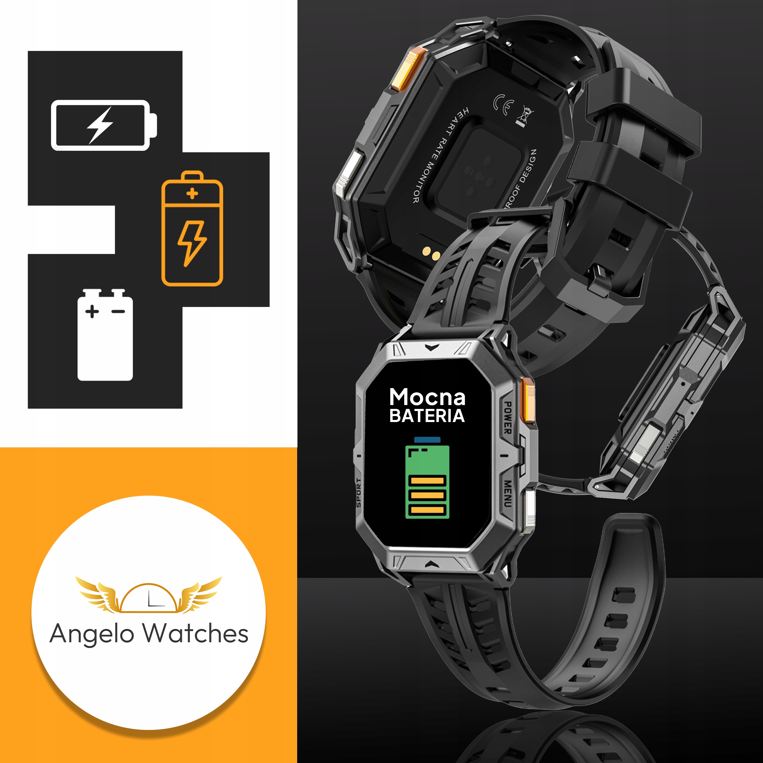 Styl i wytrzymałość zamknięte w pancernej, nowoczesnej konstrukcji. Smartwatch Angelo Watches® AX1-PRO to idealny wybór dla mężczyzn, którzy potrzebują zegarka odpornego na wszystko – z funkcjami klasy premium i potężną baterią do 25 dni działania.