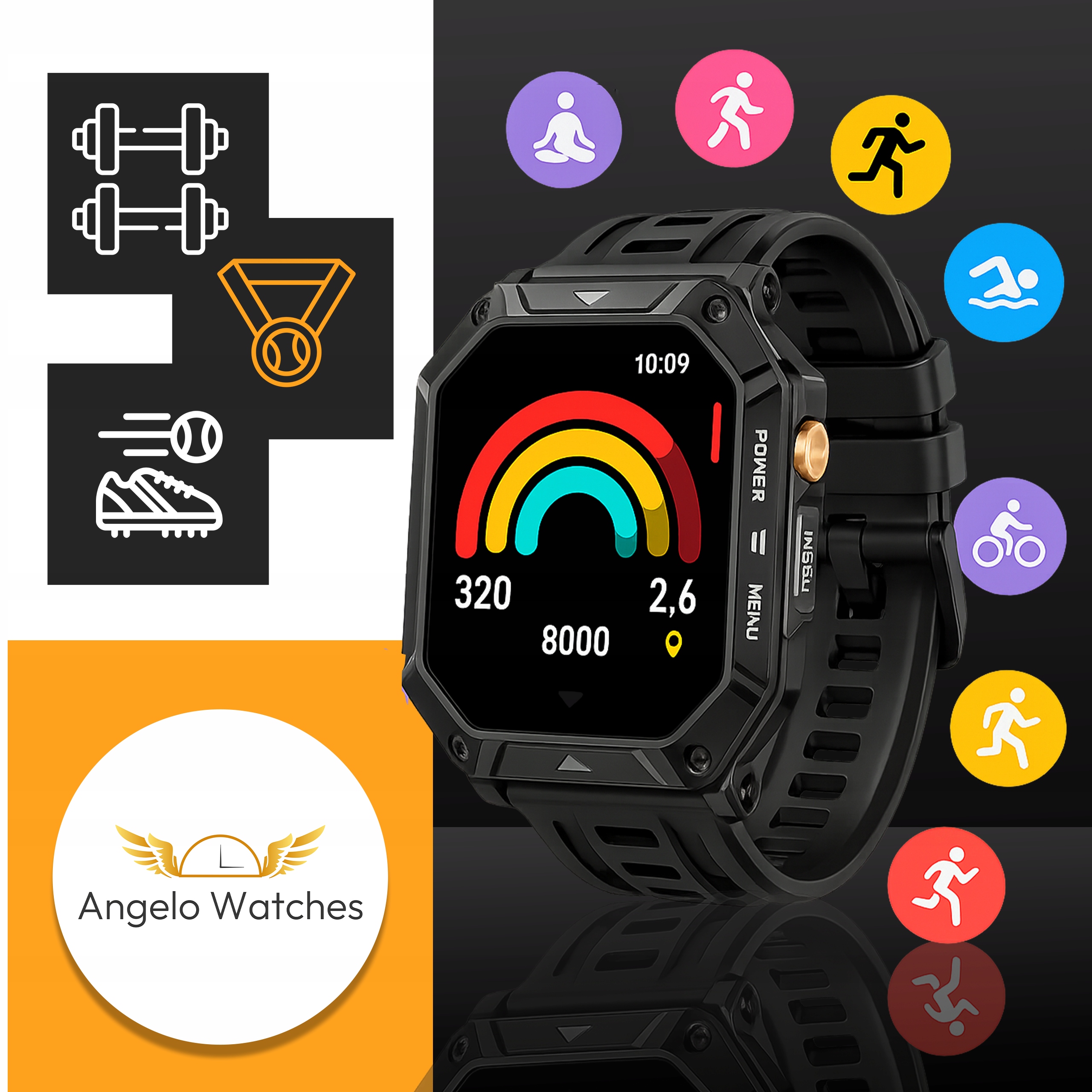 Angelo Watches® AX1-PRO to nie tylko smartwatch o militarnym charakterze – to również funkcjonalny trener na nadgarstku. Dzięki rozbudowanym trybom sportowym, możesz monitorować każdy rodzaj aktywności i mieć wszystkie kluczowe dane pod kontrolą.