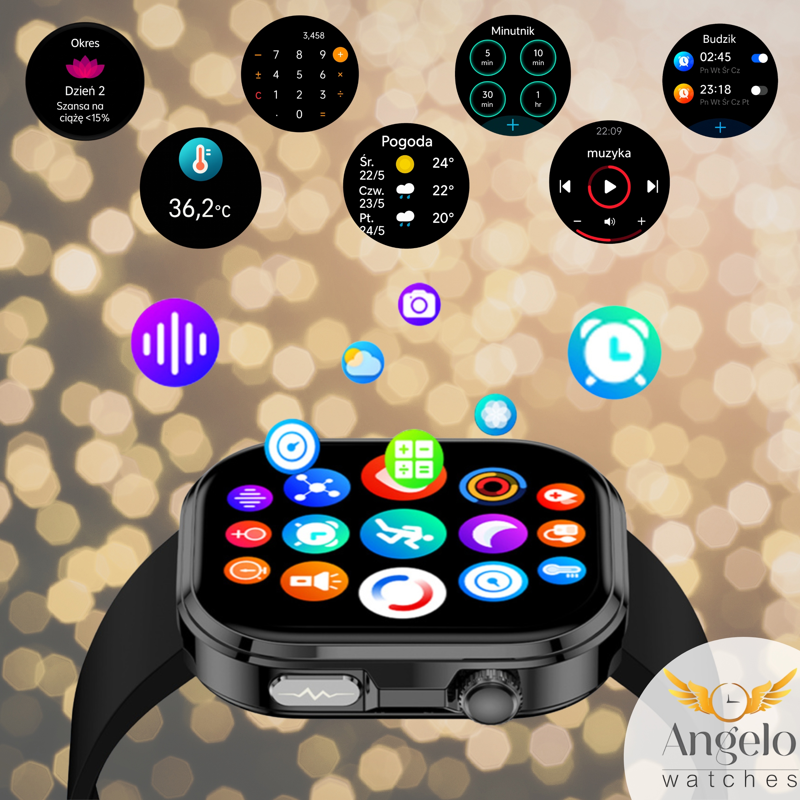 Uwaga: funkcje zdrowotne mają charakter informacyjny (wellness). Smartwatch nie jest wyrobem medycznym i nie zastępuje profesjonalnych urządzeń medycznych ani konsultacji lekarskiej.