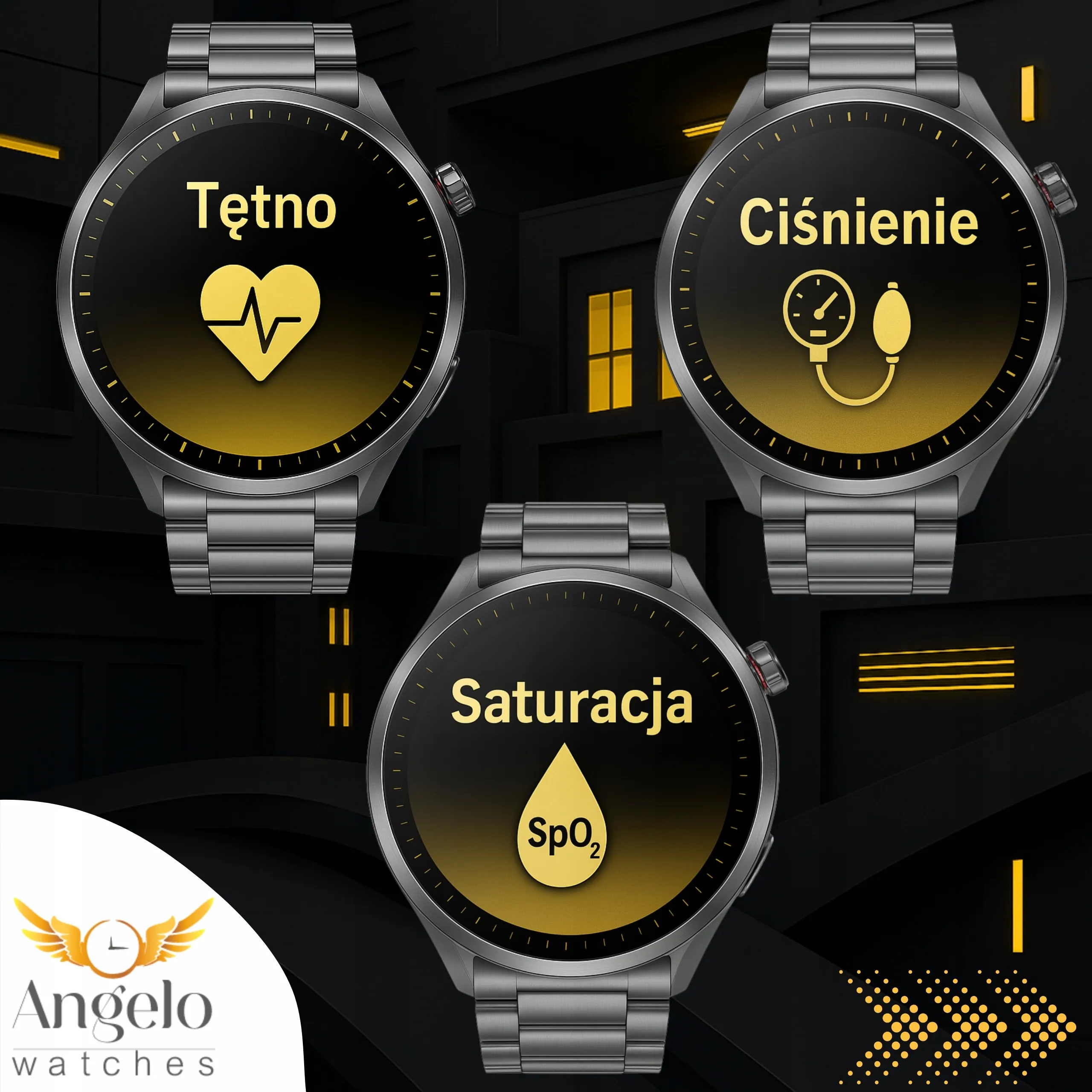 Na zdjęciu: smartwatch Angelo Watches® AT475 w czterech eleganckich stylizacjach – dopasuj styl do sytuacji!